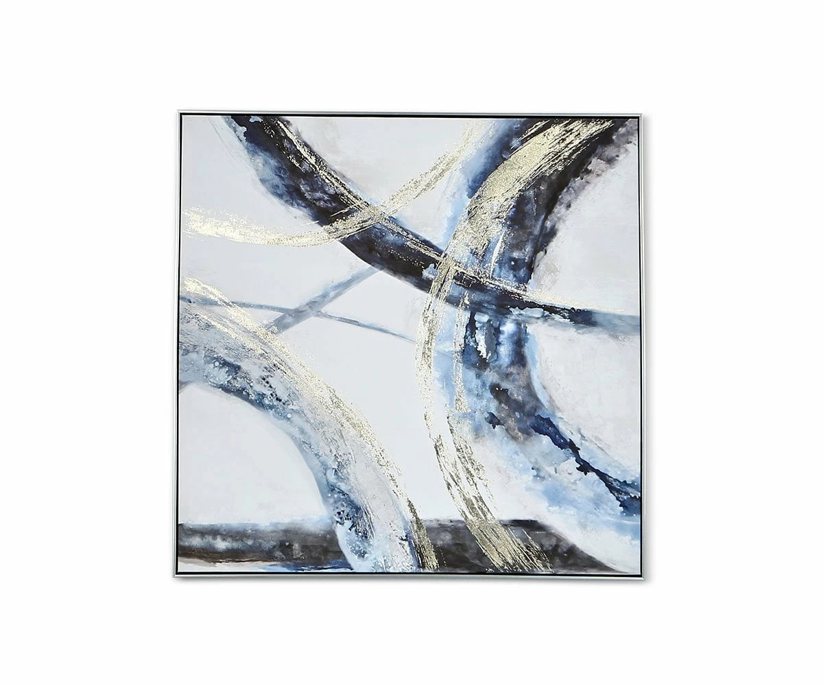 Dress up bare wall with the Circling Movement l. Sweeping brush strokes in cool tones provide movement and harmony. The square canvas is complete with a modern, minimalist frame and is ready to hang.