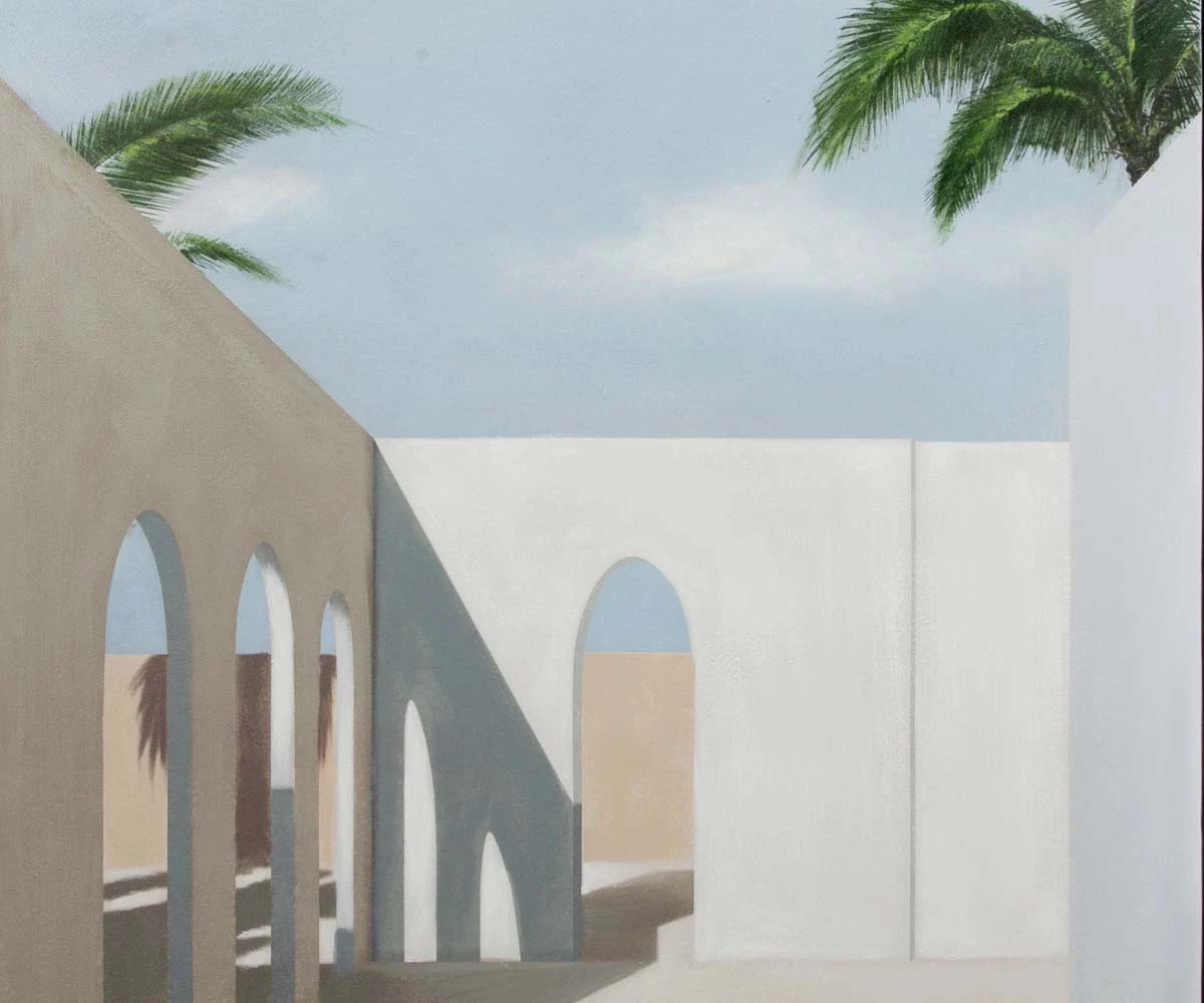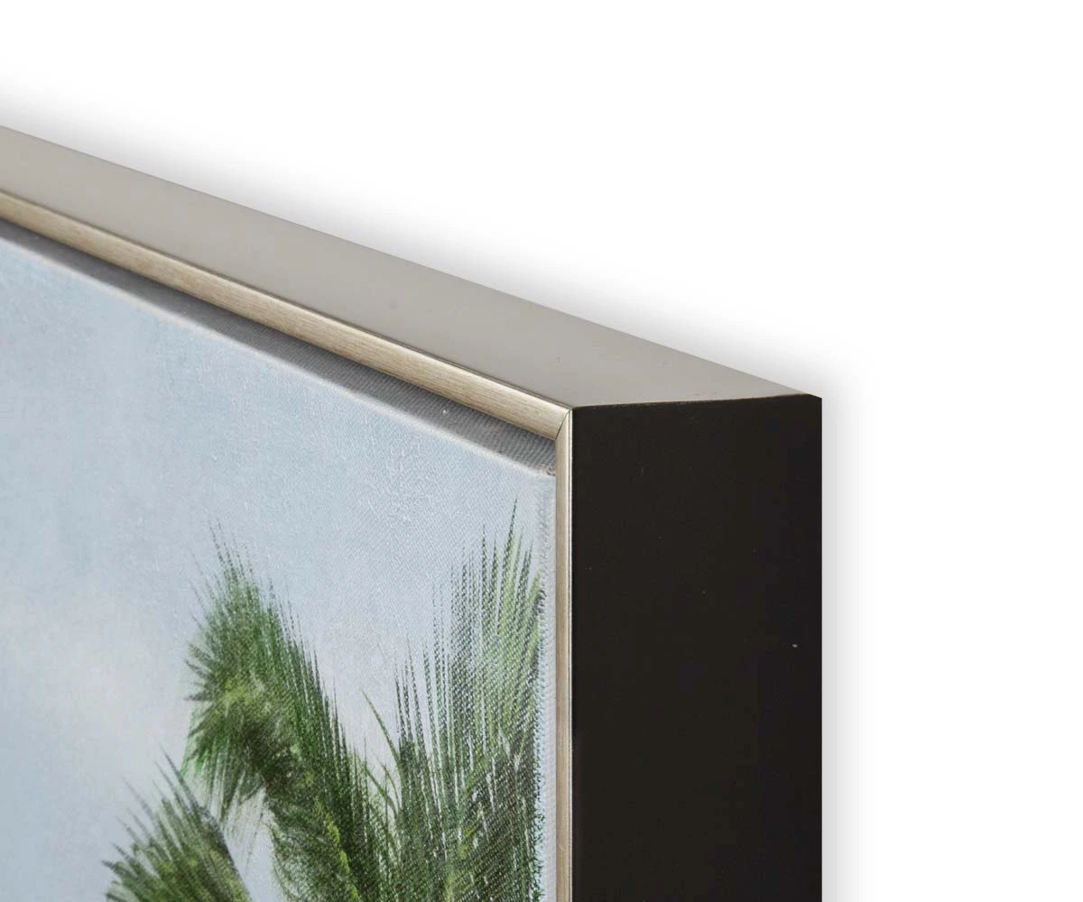 The Distant Escape I Oil Painting fills your home with the ambiance of faraway lands. Depicting a sunny cityscape punctuated with emerald palm trees, this piece captures the essence of tropical getaways filled with warm summer breezes and cool dips into a sparkling cerulean sea. Hand-painted with 100% oil paint on canvas, this piece is finished with a modern silver and black frame. The clean architectural motif of this contemporary painting can easily blend with any number of decor styles. Pair this piece with the Distant Escape II Oil Painting to sate your feelings of wanderlust and bring a sense of sun-drenched tropical escape to your home. Distant Escape II Oil Painting sold separately.