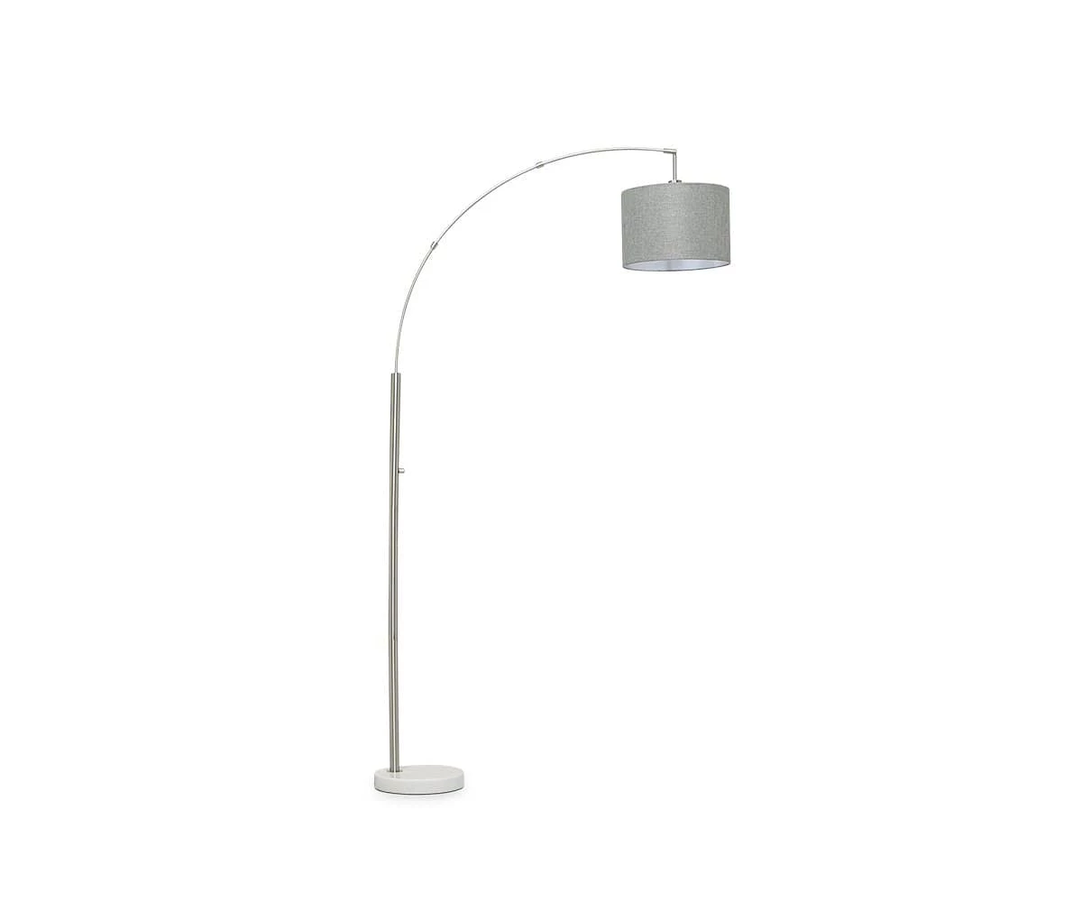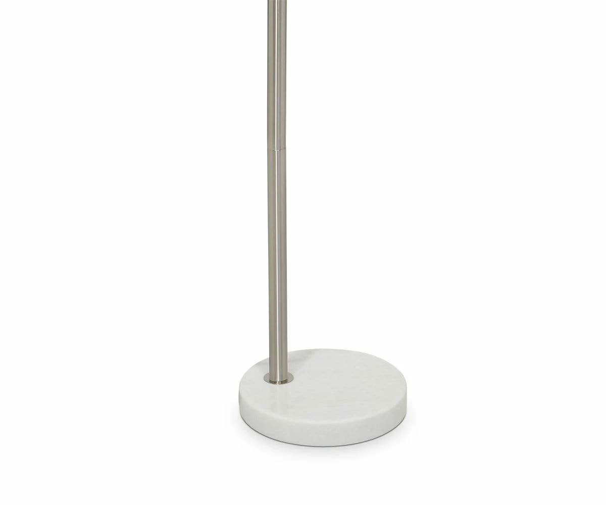 The graceful Elegans Floor Lamp features a single lampshade in a pleasing natural hue hung from an arching stainless steel frame. A smooth marble base anchors this piece, which is both functional and elegantly minimalistic in its design.
