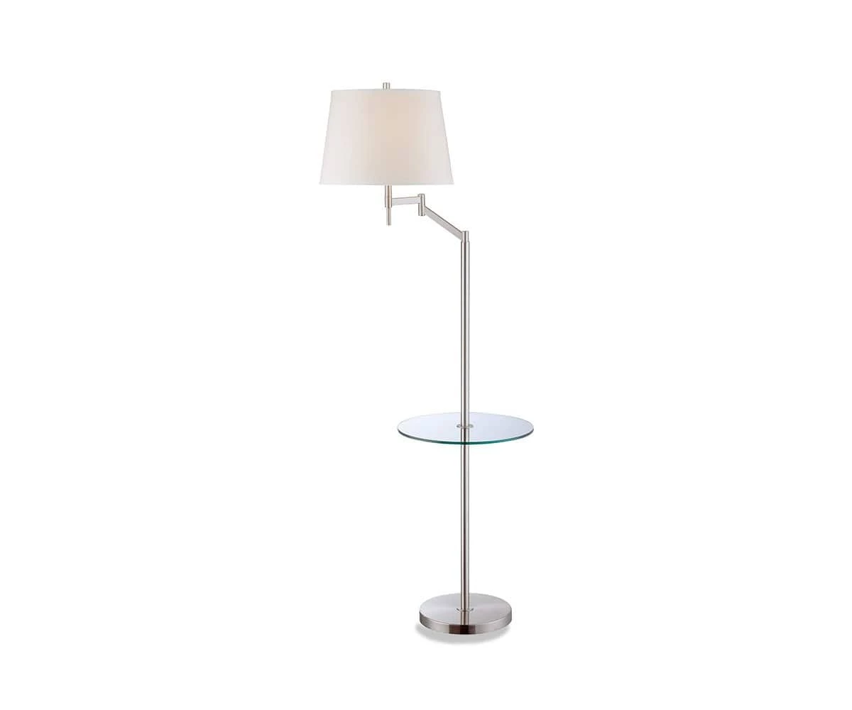 Refresh and elevate your favorite reading nook with the Flynn Floor Lamp. An ideal floor lamp for any living space, this lamp blends form and function seamlessly. Supported by a sturdy metal base, this lamp features a convenient glass tray perfect for holding drinks, snacks, remotes or your favorite reading material. This lamp also features a pivot mechanism with two swivel points that allows you to adjust the head of the lamp to shine directly where light is most needed, and is topped by a white fabric shade that lends itself to quality lighting. Layer this lamp with your overhead lighting and enjoy the warm, calming effect that a beautifully illuminated room has on your day-to-day.