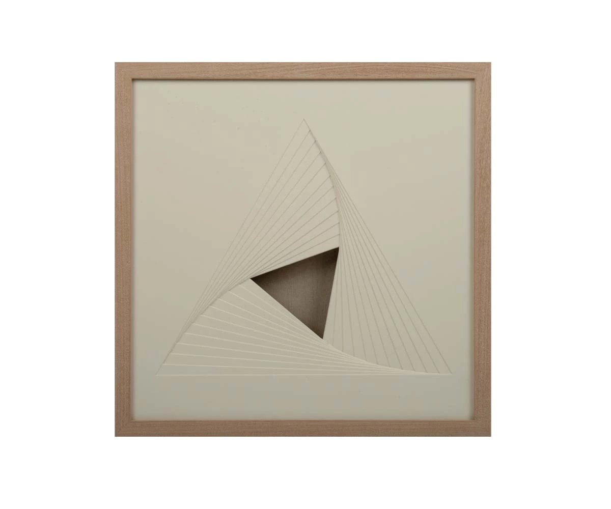 Layered Tranquility Wall Art reveals hidden depths as the viewer looks more closely. Carefully crafted, this work showcases multiple cream-colored pages in soothing hues that blend well with the neutral-toned wooden frame. Set within the borders of a multidimensional triangle, this piece features layers of paper designed to give a sense of an artistic ebb and flow. Layered Reflection and Layered Symmetry each sold separately.