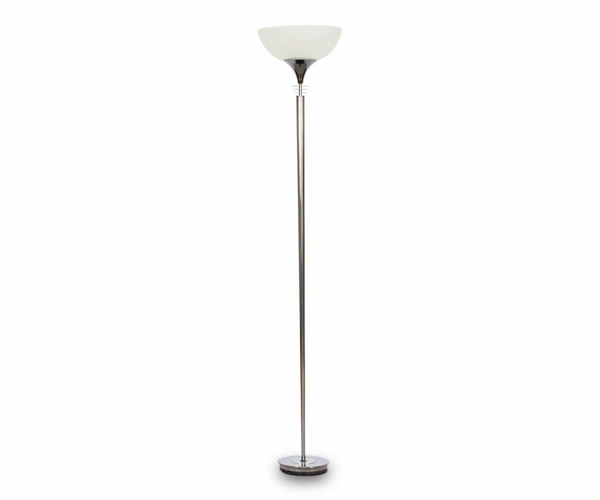 Enhance your home with the Liatris Torchiere Floor Lamp. This deco-inspired lamp features a sleek satin steel base with three horizontal disks just below the socket to provide a unique transition from shade to stem.